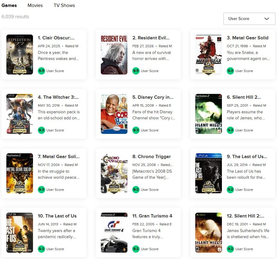 A colocação de Resident Evil Requiem no Metacritic chama atenção por superar jogos considerados referências históricas. O título aparece à frente de produções como Silent Hill 2, Chrono Trigger e Metal Gear Solid 3 no ranking organizado por nota dos usuários.